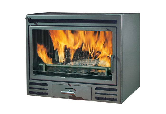 Teplovzdušná kazetová krbová vložka na drevo Edilkamin RIGA 54 s liatinovým vnútrom, predným dielom z ocele a profilmi dvierok z čiernej lakovanej ocele. Doplnená mechanizmom pre automatickú reguláciu komínovej klapky.