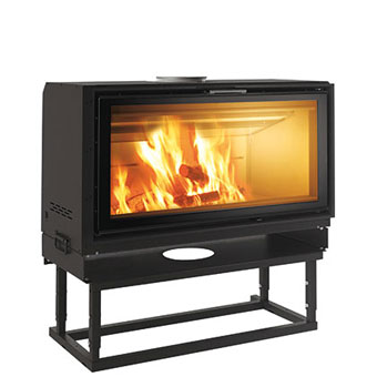 Teplovzdušná krbová vložka na drevo Edilkamin SCREEN UP 100 s moderným dizajnom a širokým výhľadom na oheň ponúkajú malá vyklápacie dvierka s väčším pohodlím a žiadnym únikom popola z otvoru ohniska.